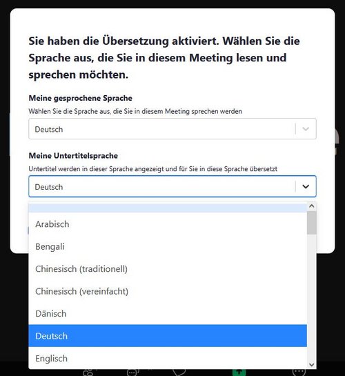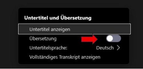 Um sich übersetzte Untertitel anzeigen zu lassen, schalten Sie bitte auch die Übersetzung ein und wählen unter “Meine Untertitelsprache” Deutsch bzw. Ihre bevorzugte Sprache aus: